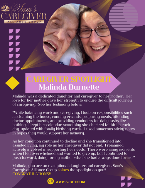 Sam’s Caregiver Alliance Group envisions a future where every caregiver is honored, supported and empowered- surrounded by a compassionate community and recognized as a vital force in shaping a more caring world.